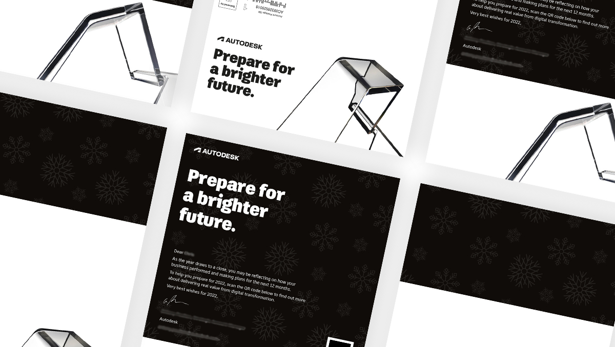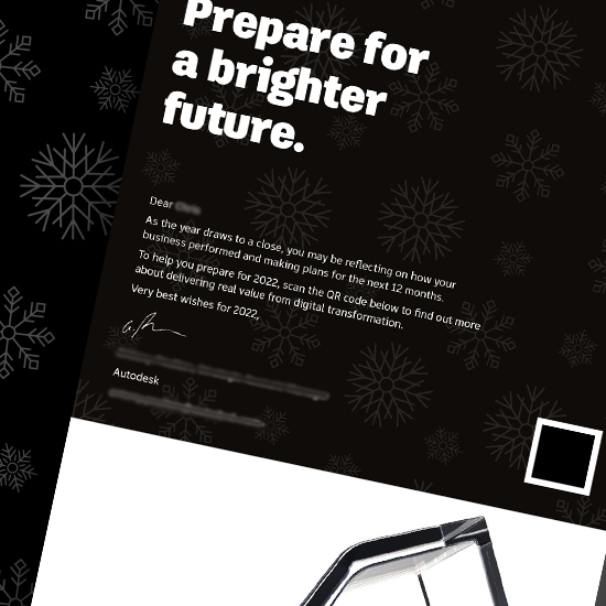We carried out a creative development process and presented a number of different design options, both in terms of their look and feel and how the mailer would be packaged. The final concept was chosen because it strongly invoked the new Autodesk brand in a dynamic way, while featuring wintry snowflake graphics that grounded the design in the seasonal theme. It was important that the design and copy wasn’t focused on one religious celebration over another, so that the mailer was suitable for a wide range of markets. We then developed the final design, including copywriting headlines and messaging, with a personalised introduction for the customer. The mailer also included the relevant account manager’s contact details and a QR code that directed recipients to a Folloze board tailored to their industry.