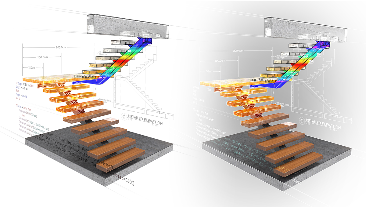 We were tasked with taking an AutoCAD model of a staircase and transforming it into a hero image that highlighted key themes of the campaign. The image needed to be visually compelling, while also remaining true to the design and manufacturing themes – which included 2D to 3D, parametric design, simulation, and design automation.
