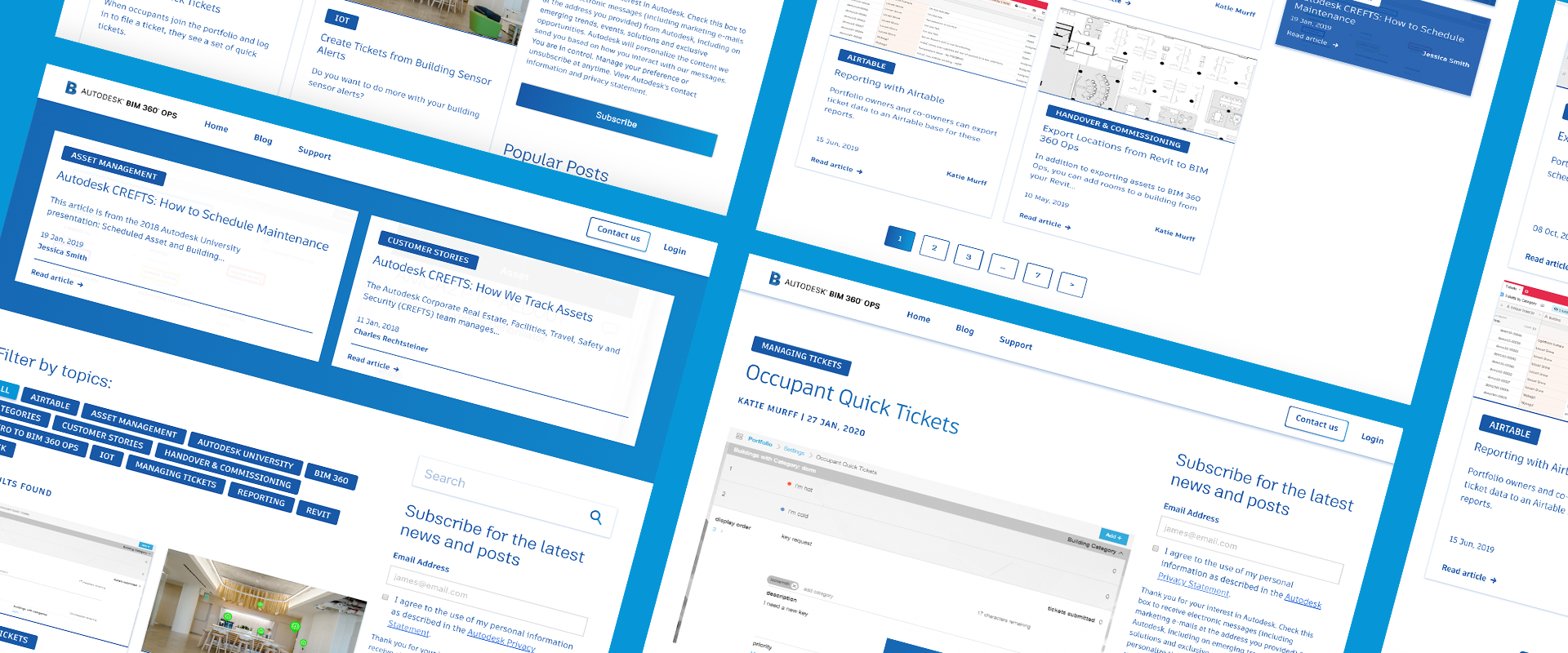 We also designed a new BIM 360 Ops blog, which was inspired by the design of the BIM 360 website as well as the existing Convergence blog. The BIM 360 Ops blog showcases the most popular blogs, has a dedicated space for featured posts, and allows users to filter based on their specific requirements.