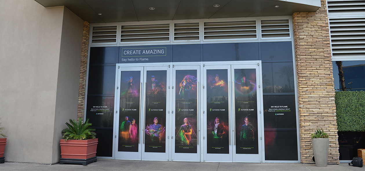 Choosing not to follow the crowd can get you noticed – as long as your customers still know where to find you. For the NAB 2017 event, Autodesk sidestepped the main event hall, opting instead to set up sales and demo rooms in a nearby hotel. Enter eye-catching graphics to highlight Autodesk’s presence.