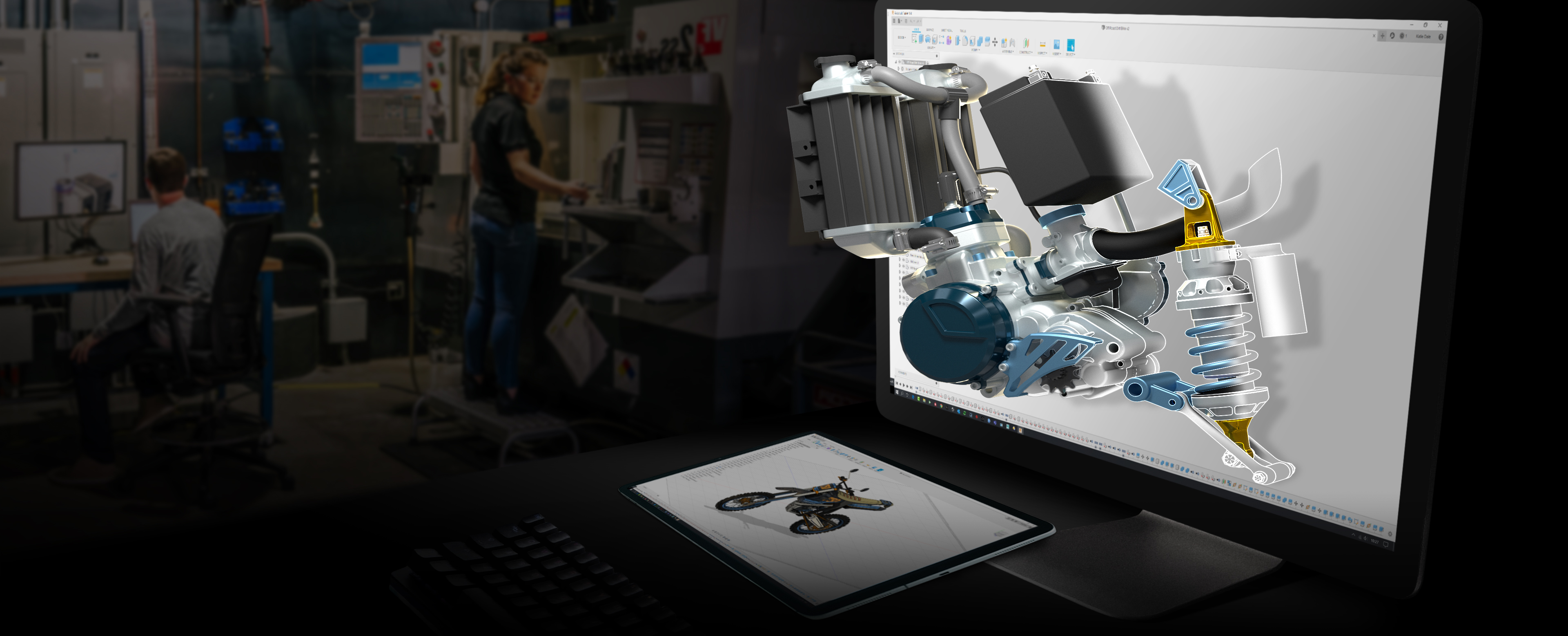 To bridge together the end-to-end nature of Fusion 360 we combined a foreground and a background image. In the foreground we see the product design phase across multiple devices, whilst in the background we see the manufacturing process.
