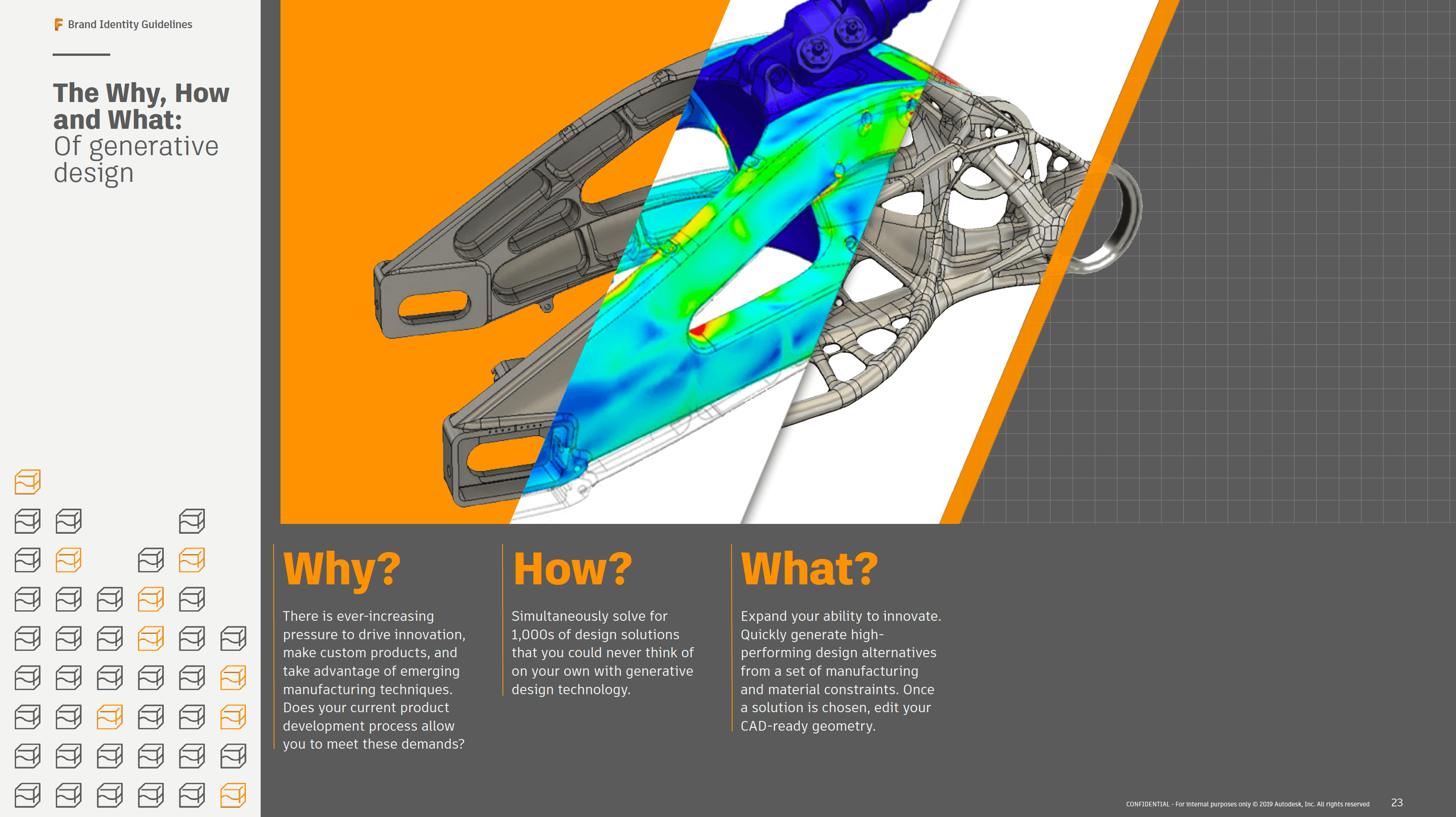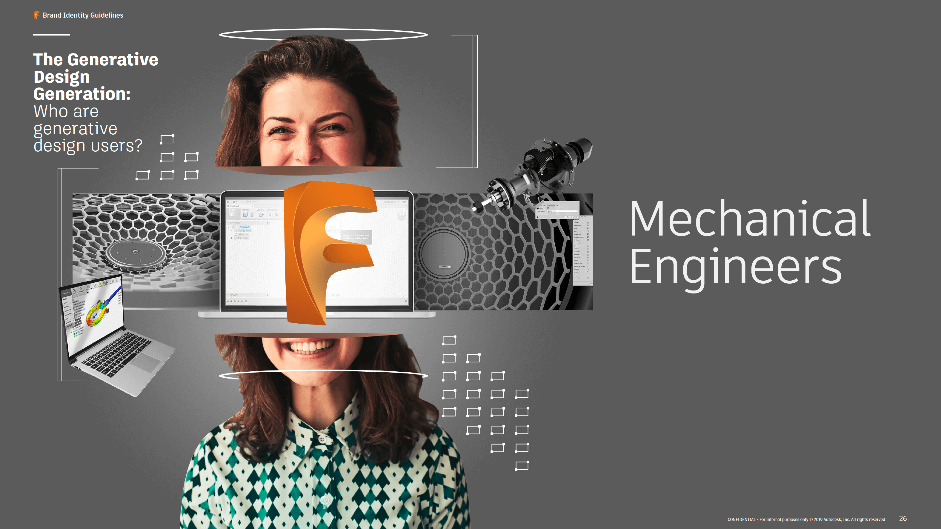 A key inclusion in the brand book was the engaging imagery that was not only relevant to the users but also related closely to the information being portrayed. To drive home the creative potential of the brand, we incorporated and developed images that were true to Fusion 360 by either being of people working with the software or of rendered images created from within the software itself.