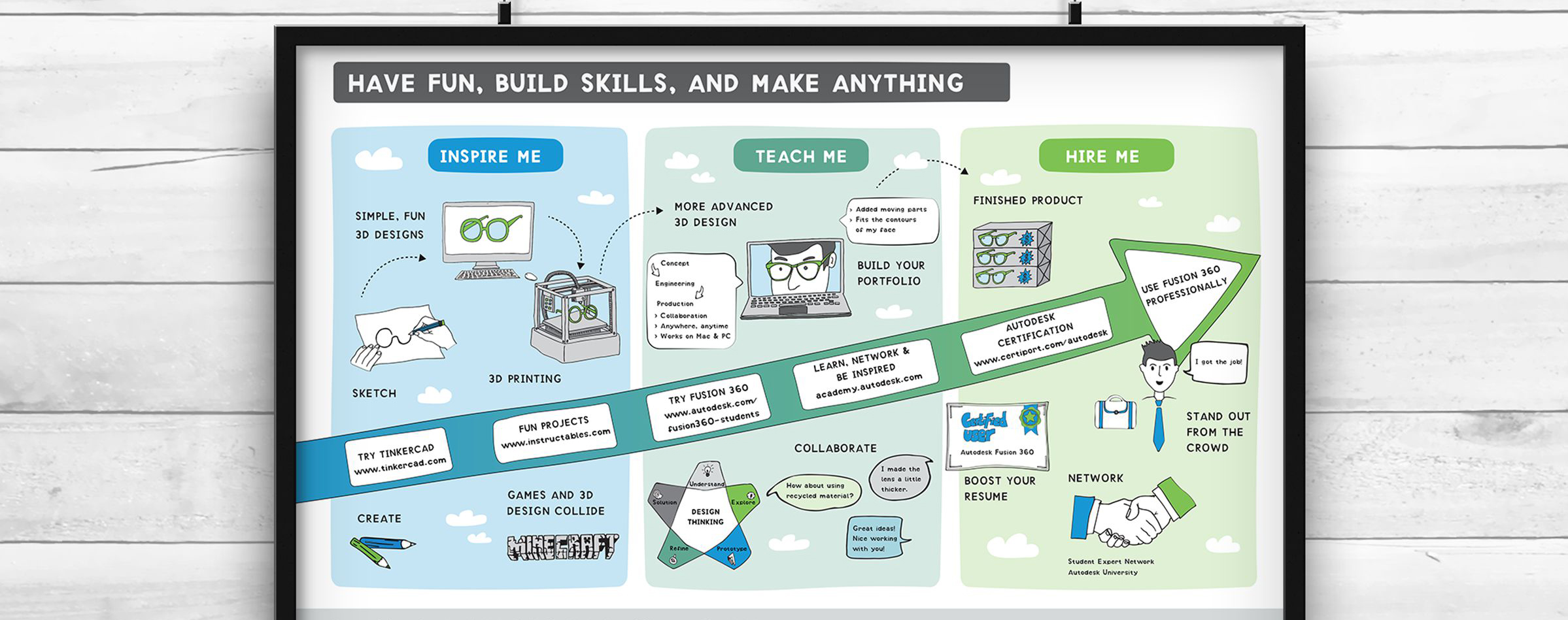 With a youthful and quirky design, the Making Starts Here website acts as a learning roadmap; directing students to the right 3D design tools, inspirational content and challenging tutorials that will help them to develop their skills from Tinkercad though to Fusion 360.
