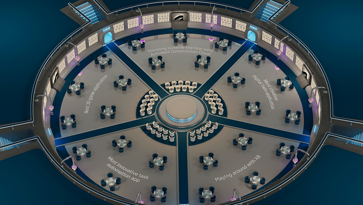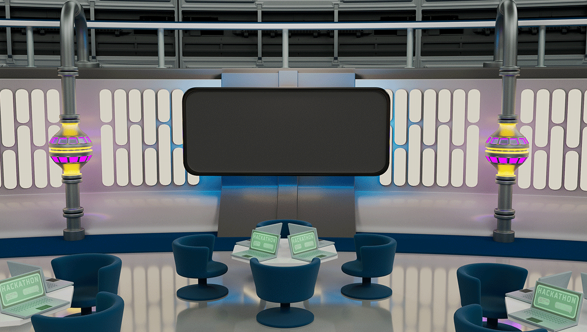 There was already an existing hackathon image from which we drew inspiration, as well as some examples of environments that gave us a visual direction to follow. We chose to use a space, sci-fi theme, from which we created a mainstage, a specific number of breakout areas and a lounge for attendees to network—or float in space—at ease. The whole environment was carefully designed and rendered in 3D for the Spatial platform, allowing users to zoom in and check out specific details or zoom out to see the entire event from afar.